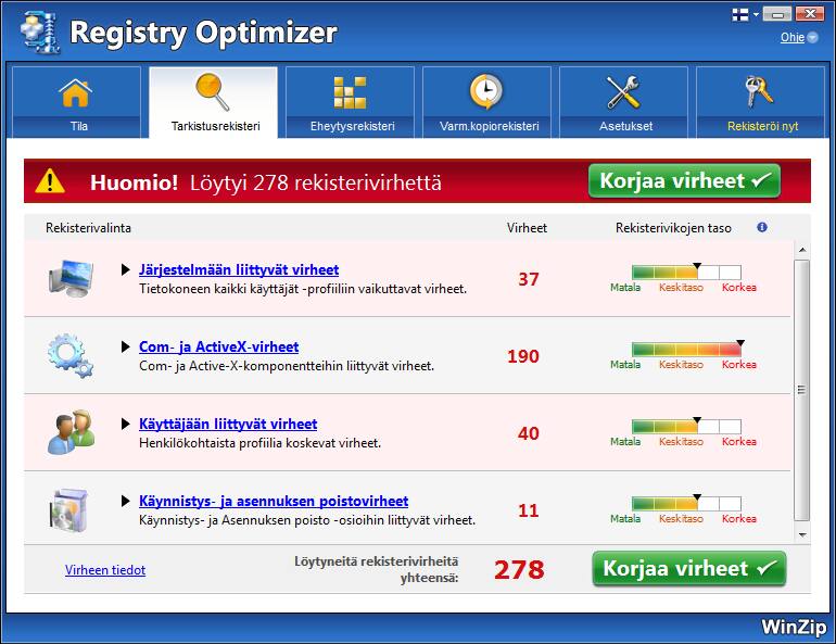 WinZip Registry Optimizer tarjoaa kaksi helppokäyttöistä rekisterityökalua, jotka tekevät työt kokonaan puolestasi! Registry Cleaner auttaa estämään tietokoneen kaatumisen ja järjestelmävirheiden syntymisen tarkistamalla ja siivoamalla rekisterin automaattisesti, poistaen samalla tarpeettomia kohtia rekisteristä. Registry Optimizer korjaa, järjestelee uudelleen ja pakkaa Windows-rekisterin parantaakseen suorituskyvyn ja maksimoidakseen nopeuden.